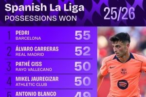 西甲夺回球权次数排行:佩德里55次居首,卡雷拉斯52次第二